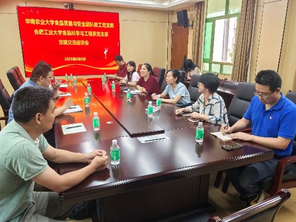 6月6日上午,学院食品质量与安全团队教工党支部于学院301会议室举行党建交流座谈会,会议特别邀请第四批全国样板党支部合肥工业大学食品科学与工程系党支部书记何述栋副教授进行经验分享。此次活动旨在充分发挥党建引领作用,推动党建与业务工作深度融合,构建双方互促共进、同频提升的发展格局,实现党建引领与业务工作的双向赋能。