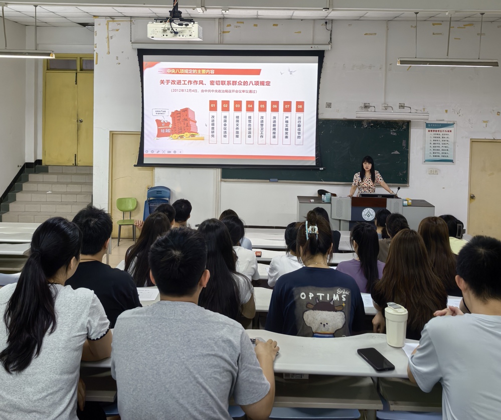 本次党课采用“案例警示+制度解析”相结合的双维教学模式,分析了中央八项规定精神在构建清朗学术生态、涵养优良师德师风方面的时代价值。在互动研讨环节,与会师生党员就如何防范学术不端、科研经费合规使用规范等议题展开热烈讨论。教工党支部副书记温棚表示,自己将会以身作则,将中央八项规定精神内化于心、外化于行,将作风建设融入自身的教学与科研工作之中,严守科研伦理与职业操守,在推进国家级一流专业建设中展现共产党员的优良作风和使命担当。