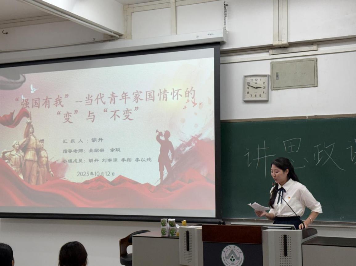 第三组胡丹同学以《“强国有我”——当代青年家国情怀的“变”与“不变”》为题,带来了一堂气势昂扬、案例丰满的思政课,一个个鲜活案例在她富有感染力的讲述中,串联成青年与国家同频共振的时代长卷,既让“家国情怀”的理论有了具象落点,又以慷慨激昂的表达点燃了在场师生的情感共鸣,生动诠释了当代青年“强国有我”的使命担当,为思政课教学注入了充满力量感的青春活力。