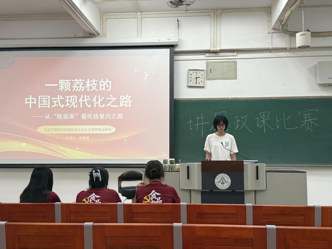 第一组的课程为《一颗荔枝的中国式现代化之路》,讲解人周漪琳从科技创新的角度展望民族复兴之路。她跳出了传统思政课的“理论灌输”模式,以岭南特色水果荔枝为切入点,将宏大的“中国式现代化”命题拆解为果农增收、产业升级、乡村振兴的生动实践,为思政课教学注入了“接地气、有温度、见实效”的创新活力。