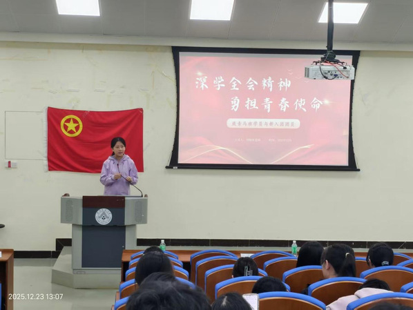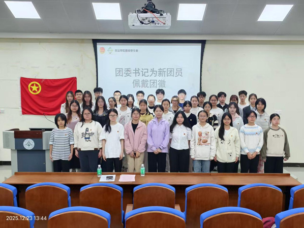 在深入学习贯彻党的二十届四中全会精神的热潮中,为切实加强共青团基层组织建设,增强新时代共青团员的政治性和先进性,食品学院于2025年12月23日下午,在食品学院院楼212教室举行了党的二十届四中全会精神宣讲活动和2025年新团员入团仪式。学院团委书记刘晓纯老师、学院团委组织部骨干以及2025年新团员参加会议。
