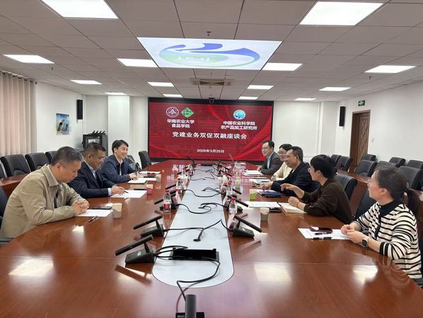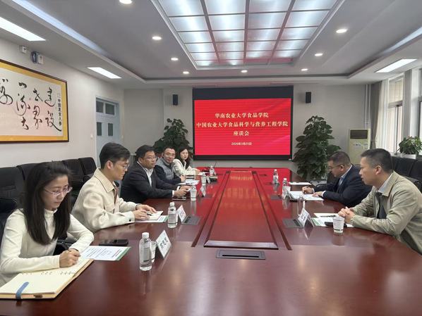 3月25日下午,我院一行来到中国农业科学院农产品加工研究所,研究所党委副书记、纪委书记邓红亮对研究所业务工作的详细介绍,并分享了研究所近年来与蒙牛、金沙河等龙头企业的合作历程,对研究所“研转一体”的创新发展模式进行了深入介绍。徐振林介绍了华南农业大学食品学院基本情况,他提出,期望与中国农业科学院农产品加工研究所在项目申报、人才培养、技术对接和企业帮扶等方面深化合作,抓住粤港澳大湾区快速发展的机遇窗口,共同提升农产品加工产业发展质效。会后,我院一行参观了中国农科院农产品加工研究所成果展示中心、中式肉类菜肴制品加工技术集成实验室。