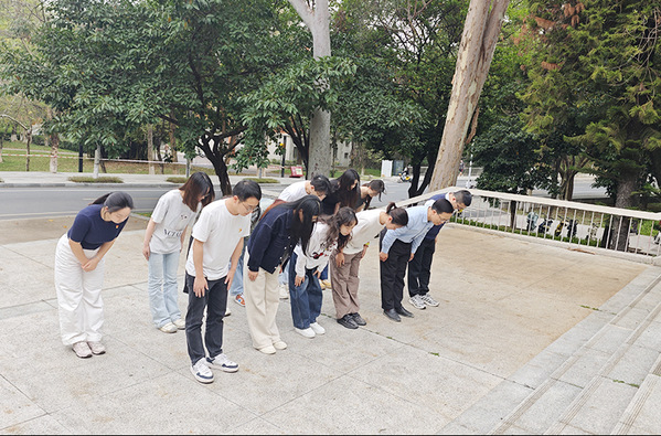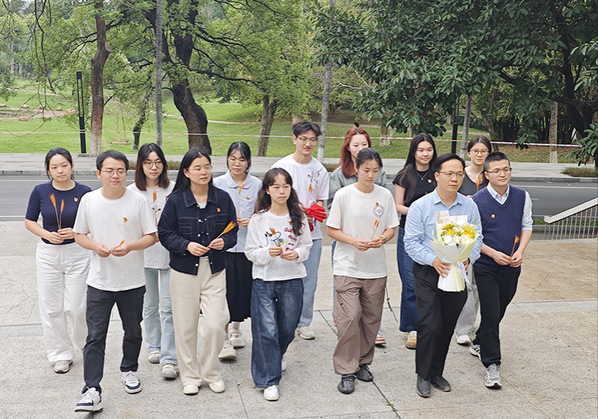 缅怀词结束后,全体党员怀着崇敬之心,向丁颖教授雕像深深三鞠躬,表达对先贤的深切缅怀与崇高敬意。随后,参与人员依次缓步向前,将手中的鲜花敬献在雕像前,以简朴而庄重的方式,传承先贤精神,寄托追思之情。