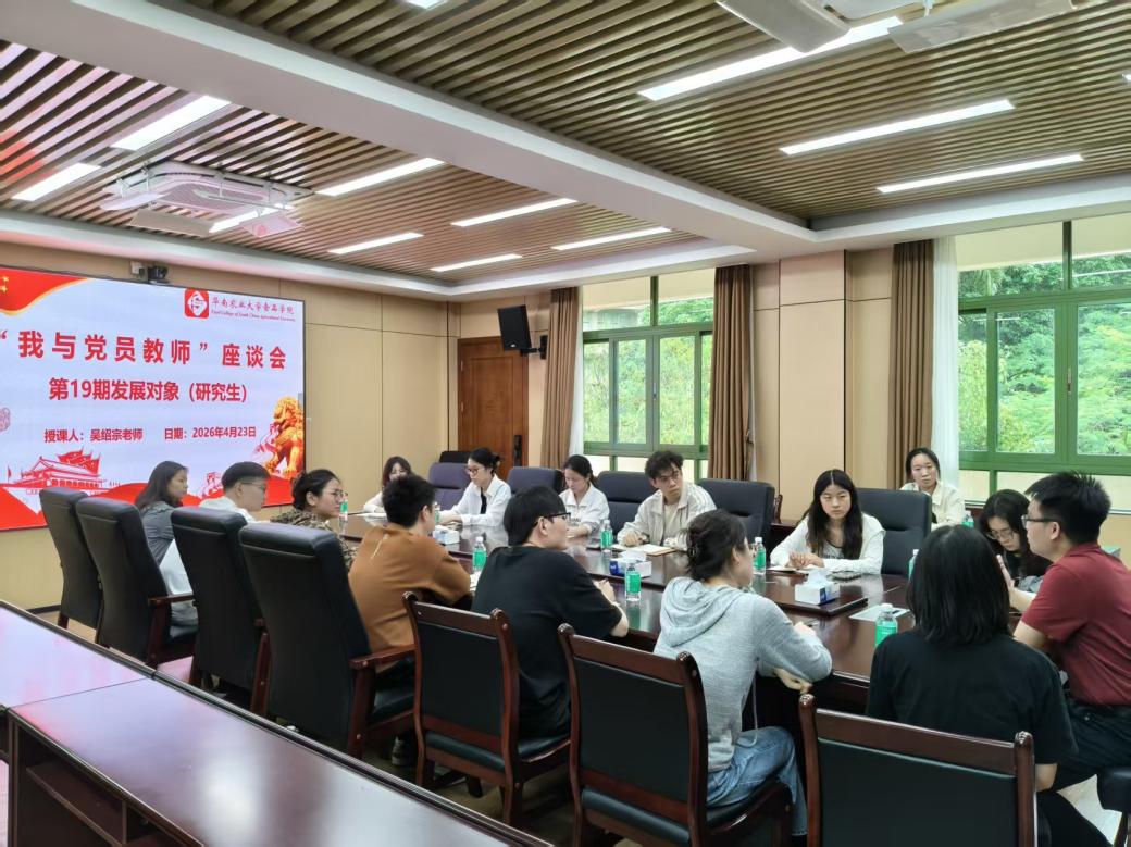 为深入学习贯彻党的二十大精神及二十届四中全会精神,引导研究生党员发展对象坚定理想信念、明确时代使命、提升党性修养,4月23日下午,我院在301会议室顺利举办第19期研究生发展对象“我与党员教师座谈会”。本次座谈会特邀食品工程研究生第二党支部书记、2025年挂任学校国际交流处副处长吴绍宗老师担任主讲嘉宾,围绕“奋进十五五新征程,争做新时代青年先锋”主题展开深入交流。