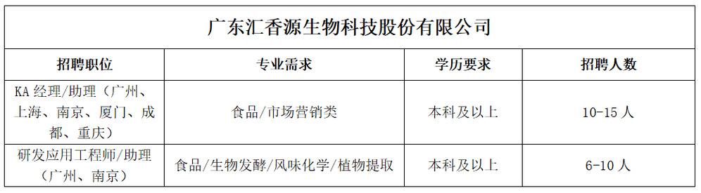 广东汇香源生物科技股份有限公司(以下简称汇香源)坐落于广州科学城科学大道182号创新大厦C2栋13/F、14/F,是中国食品产业风味和功能配料的主要创新者和引领者。公司依赖科研和创新精神持续稳健成长,主要向食品行业、保健品、医药行业、日化行业提供调味基料、功能呈味肽、天然香精、天然提取物、生物香料、营养添加物等产品。公司擅长为各行业的领导品牌度身订制、开发具有创意的新产品。
